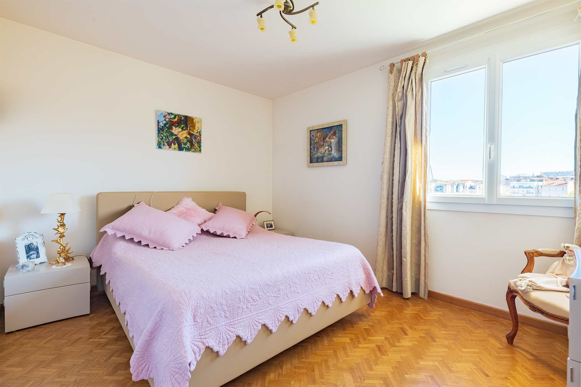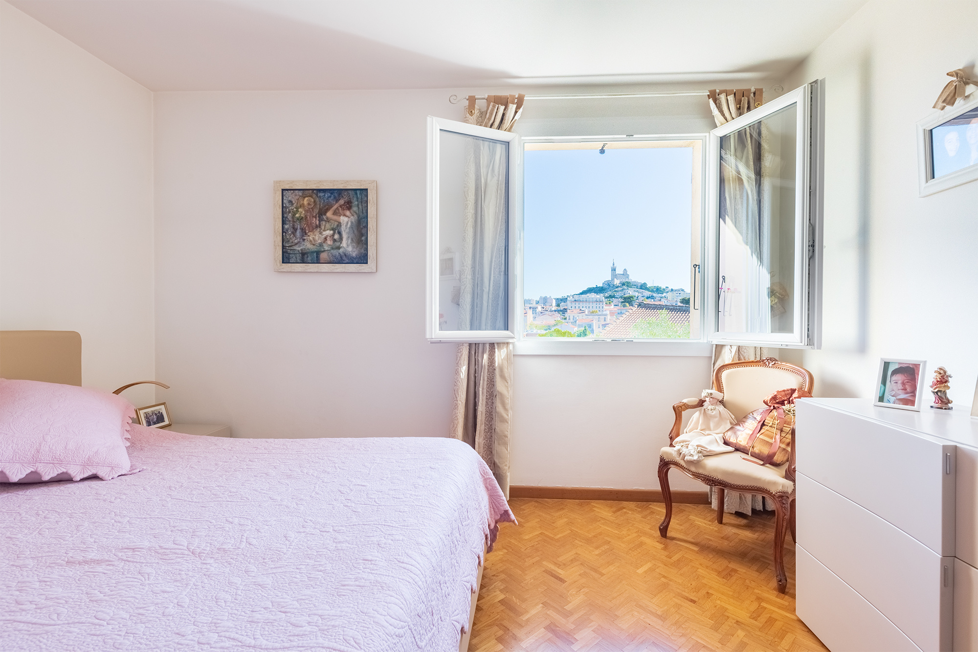 A l'étage Trois chambres avec vue sur notre Dame de la Garde,une salle de bain et une salle d'eau ainsi que de grands placards de rangement.La maison est vendu avec un garage de 16.5m2 et une place de stationnement dans la résidence à deux pas.Possibilité de les dissocier de la vente également. La maison n'est pas soumise au statut de la copropriété.